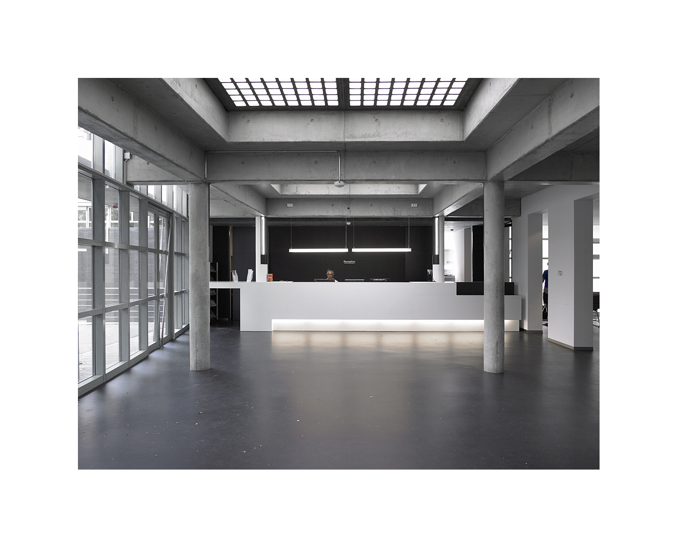 La seconde étape de rénovation a concerné le hall d’entrée et le réfectoire. La réception a été déplacée pour permettre un accès depuis la cour, améliorer les conditions d’accueil et d’orientation des usagers. Au travers de deux meubles accueillant différentes fonctionnalités; armoires, affichages, poste internet,... le réfectoire a été séparé des espaces de réception. Le lieu gagne en sobriété, en ouverture et en lisibilité des espaces.