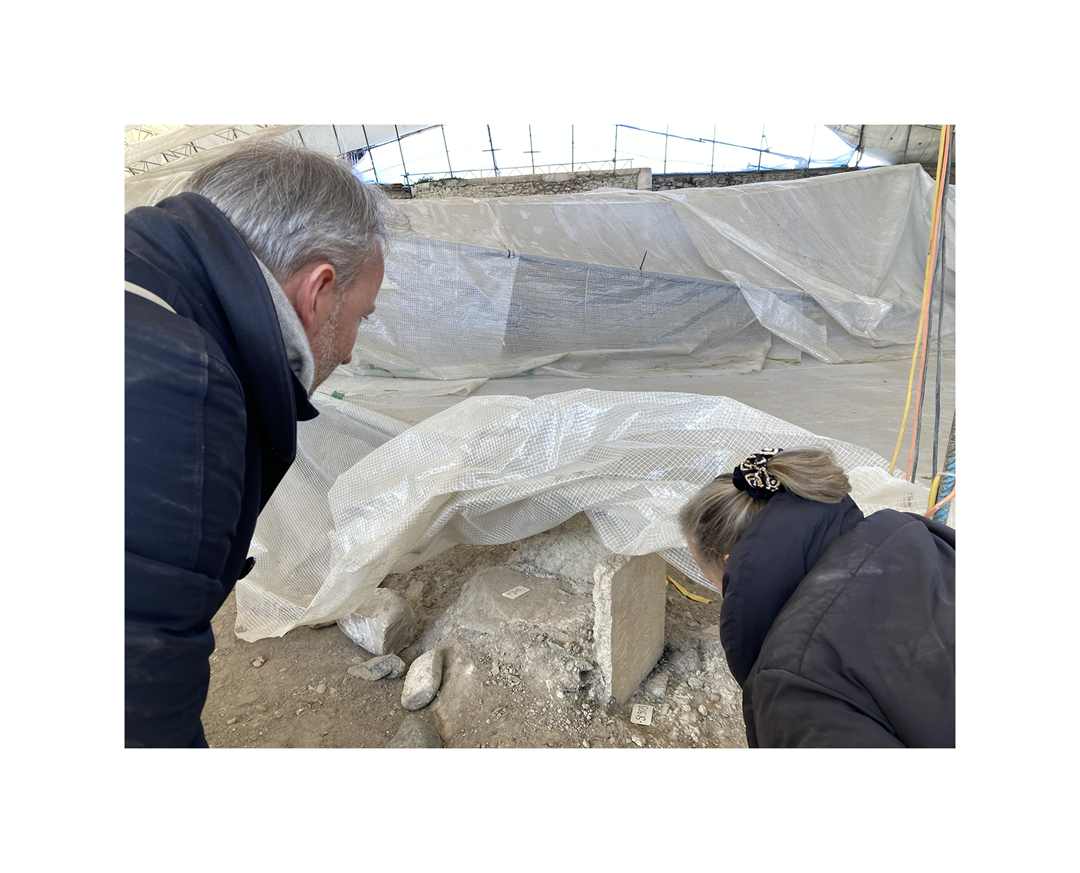 Pierre de réemploi d’époque romaine intégrée dans un élément de tombe chrétienne. Discussion entre Madame Evelyne Broillet-Ramjoué, archéologue responsable des fouilles pour le service d’archéologie de l’Etat de Genève et Monsieur Philippe Ramseier, architecte du projet. Site archéologique de Saint-Antoine, 19 janvier 2023.