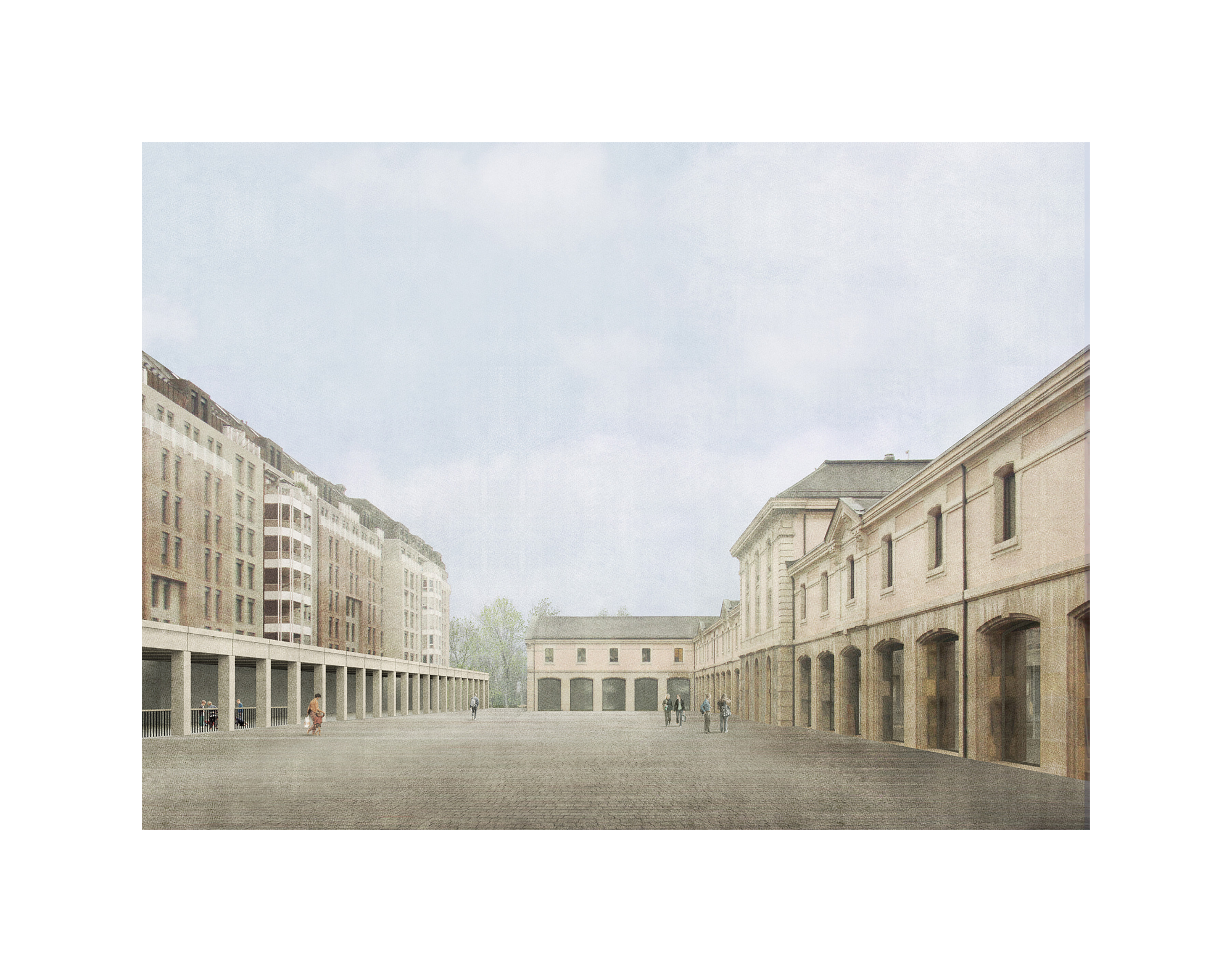 Le projet reconnaît le caractère urbain de l’espace public comme élément fondateur de la présence des Archives dans la ville. Conçu comme une grande cour, l’espace public est délimité en partie par la façade du bâtiment de l’Arsenal et sur ses deux autres fronts par un nouveau portique redéfinissant les rapports avec les bâtiments de logements. Ce dispositif articule la relation aux différents passages comme autant de parcours mettant en relation les différents bâtiments et espaces publics du quartier.
